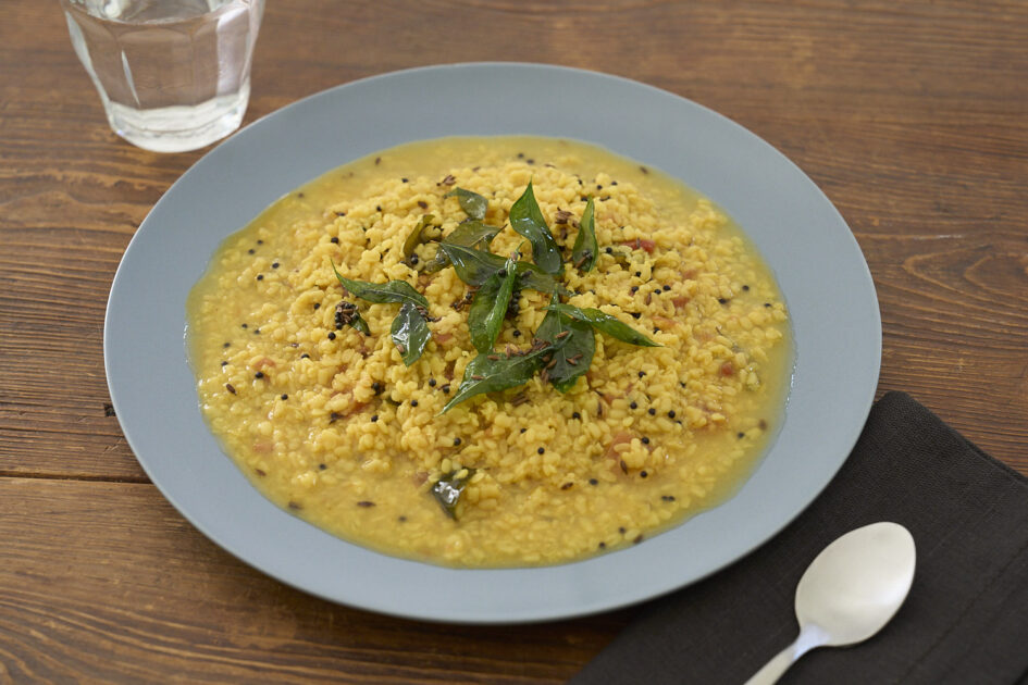 緑豆の挽き割りカレー。消化に軽く、滋養のある緑豆の挽き割りを使った、インドを代表する家庭料理の定番。